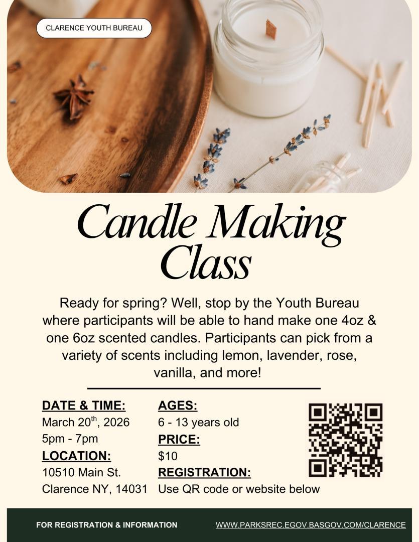 Registration for Programs Here Open Craft Time: We will have plenty of St Patrick & Rainbow themed crafts. Date: Saturdays, March 14th & 28th. Time: 1 pm - 3 pm. Ages: All ages (parents/grandparents welcomed)! Cost: Free Registration: No registration required just walk in! Location: Clarence Youth Bureau, 10510 Main St. Candy Bingo: Play for Jumbo Sized candy bars! Date: Tuesday, March 17th. Time: 6 pm – 7 pm. Ages: Family event. Cost: Free Registration: Please call (716) 407 – 2162 to register. Location: Clarence Youth Bureau, 10510 Main St. NOTE VENUE CHANGE FOR THE MONTH OF MARCH (PREVIOUSLY ALWAYS HELD AT SENIOR CENTER). Candle Making Class: Participants are able to make a 4oz and 6oz candle. Date: Friday, March 20th. Time: 5 pm - 7 pm. Ages: 6 - 13 Cost: $10 Registration: Registration required (above link brings you to our registration page). Location: Clarence Youth Bureau, 10510 Main St. Winter Coloring Contest Must be Clarence Resident. Color the sheet meant for your age group. No restriction on type of medium used. Make sure to put name, age, and contact on the back of your submission. Must submit their creations by Sunday March 22nd. Winners announce week of March 23rd, and can grab their prizes the following week. The coloring sheets are available in person at the Clarence Youth Bureau or Clarence Public Library; click here for digital copies. Special Olympics Developmental BowlingThursdays, March 5, 12, 19, 26, April 24:00-5:00 pmClarence Bowling Lanes, 10718 Main St., Clarence $5/participantRegister: https://parksrec.egov.basgov.com/clarence Changed 02/24/2026 - 4:14 pm